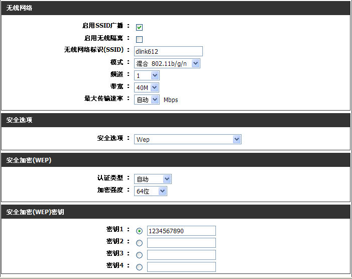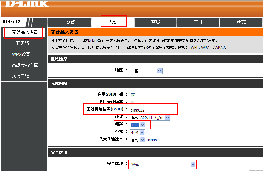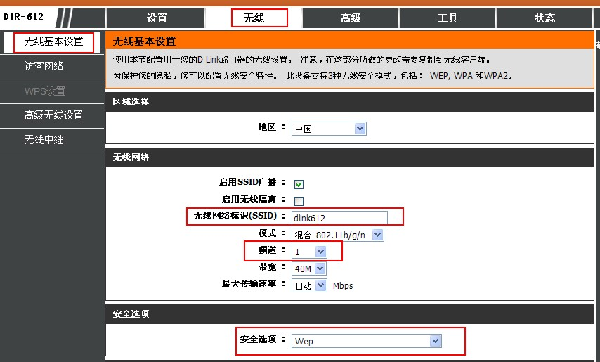 2、設(shè)置主的DIR-612-A的無線參數(shù),如圖: